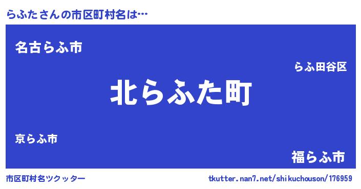 らふたさんの市区町村名は… 『北らふた町』『名古らふ市』『福らふ市』 ツクッター #市区町村名ツクッター http://tkutter.nan7.net/shikuchouson/176959/