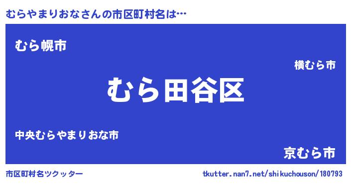 むらやまりおなさんの市区町村名は… 『むら田谷区』『むら幌市』『京むら市』 ツクッター #市区町村名ツクッター http://tkutter.nan7.net/shikuchouson/180793/