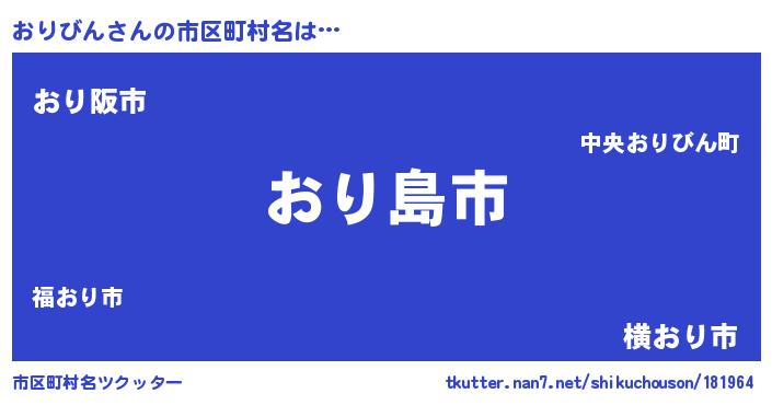 おりびんさんの市区町村名は… 『おり島市』『おり阪市』『横おり市』 ツクッター #市区町村名ツクッター http://tkutter.nan7.net/shikuchouson/181964/
