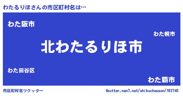 わたるりほさんの市区町村名は… 『北わたるりほ市』『わた阪市』『わた覇市』 ツクッター #市区町村名ツクッター http://tkutter.nan7.net/shikuchouson/183745/