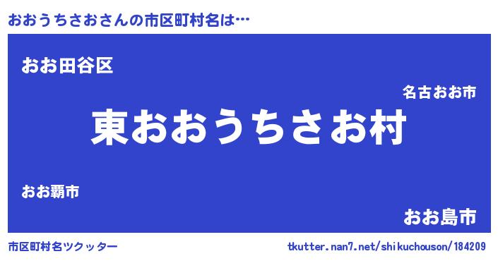 おおうちさおさんの市区町村名は… 『東おおうちさお村』『おお田谷区』『おお島市』 ツクッター #市区町村名ツクッター http://tkutter.nan7.net/shikuchouson/184209/