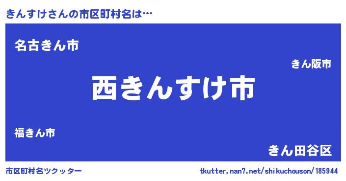 きんすけさんの市区町村名は… 『西きんすけ市』『名古きん市』『きん田谷区』 ツクッター #市区町村名ツクッター http://tkutter.nan7.net/shikuchouson/185944/