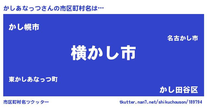 かしあなっつさんの市区町村名は… 『横かし市』『かし幌市』『かし田谷区』 ツクッター #市区町村名ツクッター http://tkutter.nan7.net/shikuchouson/189794/