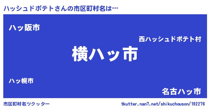 ハッシュドポテトさんの市区町村名は… 『横ハッ市』『ハッ阪市』『名古ハッ市』 ツクッター #市区町村名ツクッター http://tkutter.nan7.net/shikuchouson/192276/