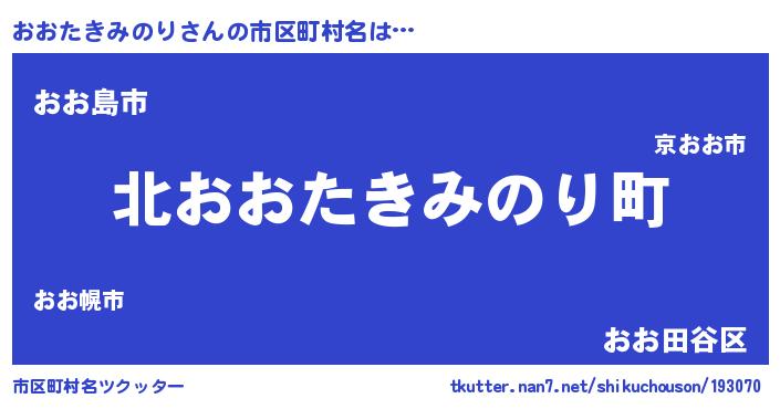 おおたきみのりさんの市区町村名は… 『北おおたきみのり町』『おお島市』『おお田谷区』 ツクッター #市区町村名ツクッター http://tkutter.nan7.net/shikuchouson/193070/