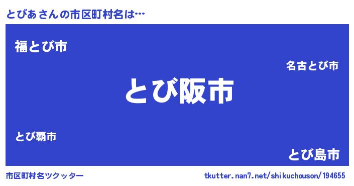 とびあさんの市区町村名は… 『とび阪市』『福とび市』『とび島市』 ツクッター #市区町村名ツクッター http://tkutter.nan7.net/shikuchouson/194655/