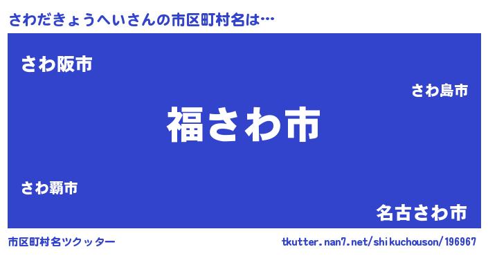 | 男性向けラノベタイトル風あだ名 | 『さわだきょうへい~年齢イコール彼女いない歴の魔法使い~』 |