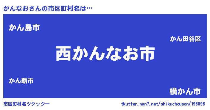 かんなおさんの市区町村名は… 『西かんなお市』『かん島市』『横かん市』 ツクッター #市区町村名ツクッター http://tkutter.nan7.net/shikuchouson/198898/