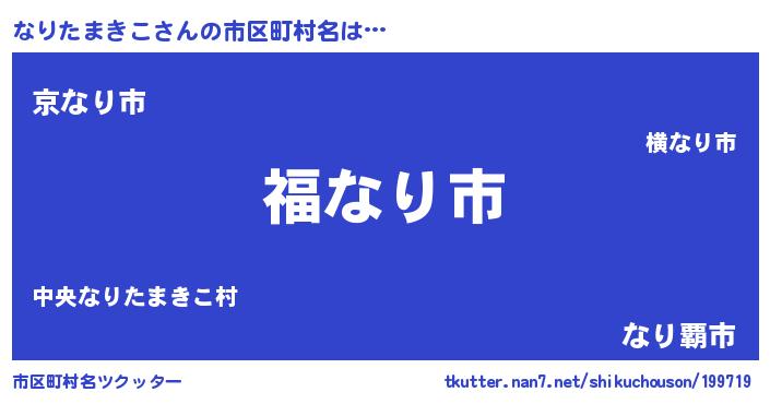 なりたまきこさんの市区町村名は… 『福なり市』『京なり市』『なり覇市』 ツクッター #市区町村名ツクッター http://tkutter.nan7.net/shikuchouson/199719/