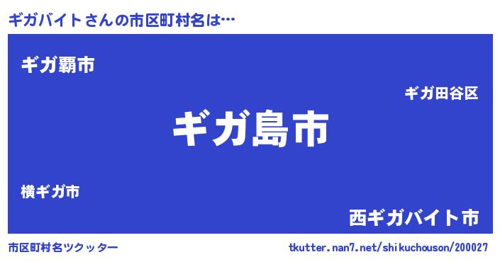ギガバイトさんの市区町村名は… 『ギガ島市』『ギガ覇市』『西ギガバイト市』 ツクッター #市区町村名ツクッター http://tkutter.nan7.net/shikuchouson/200027/