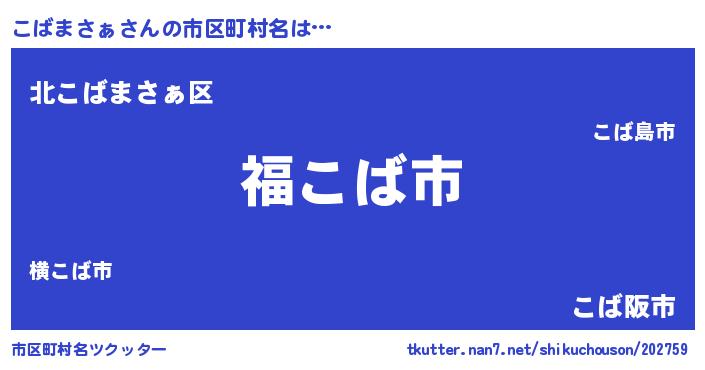 | 男性向けラノベタイトル風あだ名 | 『こばまさぁ~年齢イコール彼女いない歴の魔法使い~』 |