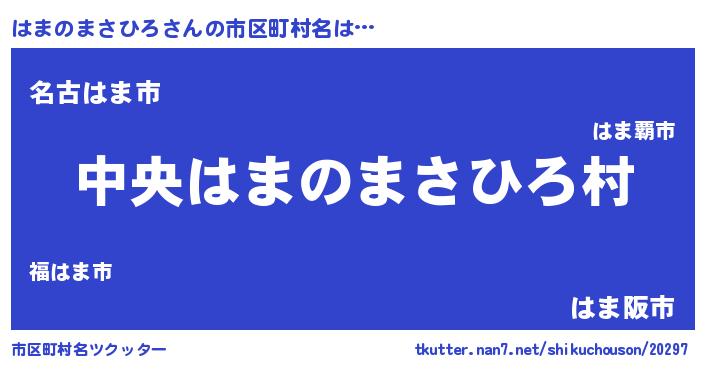 はまのまさひろさんの市区町村名は… 『中央はまのまさひろ村』『名古はま市』『はま阪市』 ツクッター #市区町村名ツクッター http://tkutter.nan7.net/shikuchouson/20297/