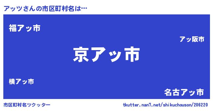 アッツさんの市区町村名は… 『京アッ市』『福アッ市』『名古アッ市』 ツクッター #市区町村名ツクッター http://tkutter.nan7.net/shikuchouson/206220/