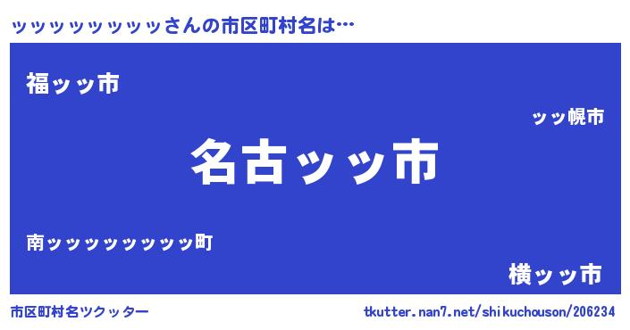 ッッッッッッッッさんの市区町村名は… 『名古ッッ市』『福ッッ市』『横ッッ市』 ツクッター #市区町村名ツクッター http://tkutter.nan7.net/shikuchouson/206234/