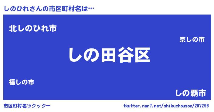 しのひれさんの市区町村名は… 『しの田谷区』『北しのひれ市』『しの覇市』 ツクッター #市区町村名ツクッター http://tkutter.nan7.net/shikuchouson/207296/