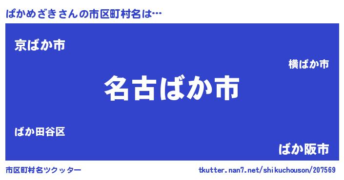 ばかめざきさんの市区町村名は… 『名古ばか市』『京ばか市』『ばか阪市』 ツクッター #市区町村名ツクッター http://tkutter.nan7.net/shikuchouson/207569/
