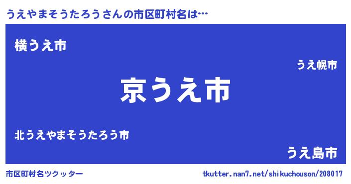 うえやまそうたろうさんの市区町村名は… 『京うえ市』『横うえ市』『うえ島市』 ツクッター #市区町村名ツクッター http://tkutter.nan7.net/shikuchouson/208017/