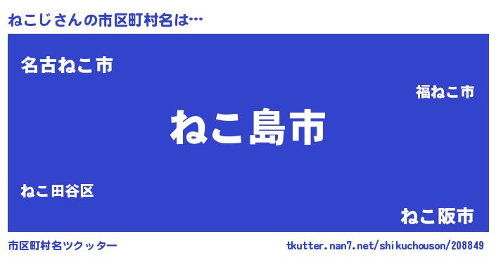 ねこじさんの市区町村名は… 『ねこ島市』『名古ねこ市』『ねこ阪市』 ツクッター #市区町村名ツクッター http://tkutter.nan7.net/shikuchouson/208849/
