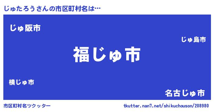 | 男性向けラノベタイトル風あだ名 | 『じゅたろう~年齢イコール彼女いない歴の魔法使い~』 |