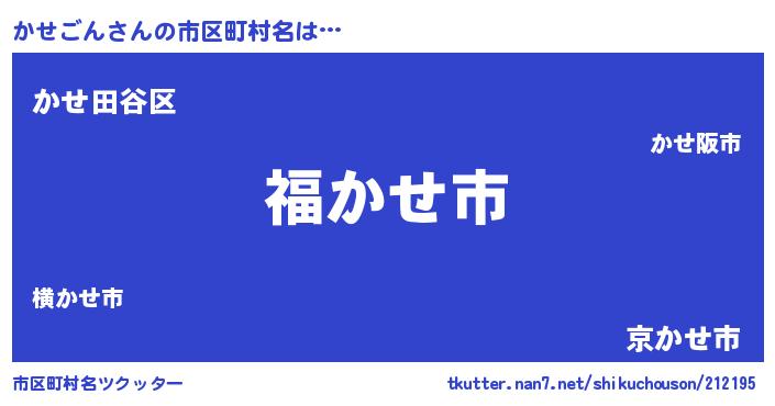 かせごんさんの市区町村名は… 『福かせ市』『かせ田谷区』『京かせ市』 ツクッター #市区町村名ツクッター http://tkutter.nan7.net/shikuchouson/212195/
