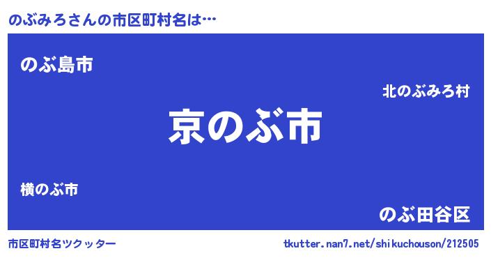 のぶみろさんの市区町村名は… 『京のぶ市』『のぶ島市』『のぶ田谷区』 ツクッター #市区町村名ツクッター http://tkutter.nan7.net/shikuchouson/212505/