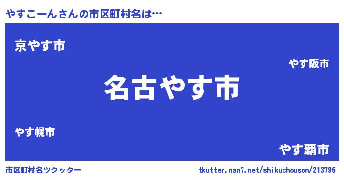 やすこーんさんの市区町村名は… 『名古やす市』『京やす市』『やす覇市』 ツクッター #市区町村名ツクッター http://tkutter.nan7.net/shikuchouson/213796/
