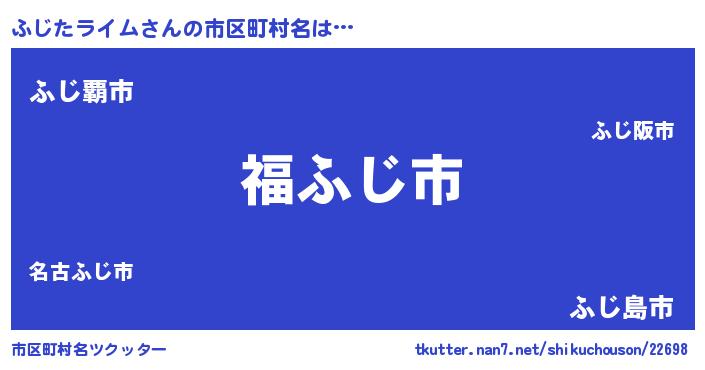 ふじたライムさんの市区町村名は… 『福ふじ市』『ふじ覇市』『ふじ島市』 ツクッター #市区町村名ツクッター http://tkutter.nan7.net/shikuchouson/22698/