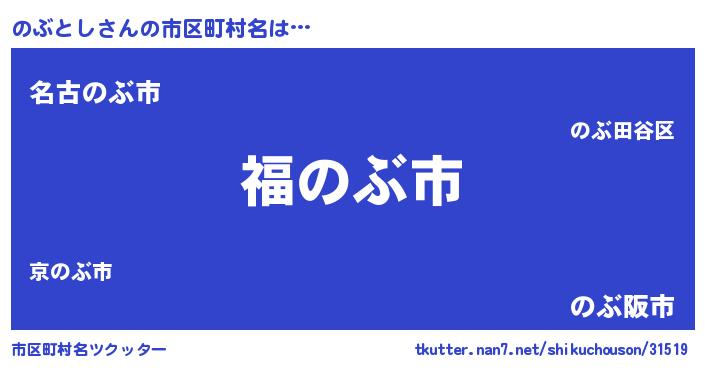 | 男性向けラノベタイトル風あだ名 | 『のぶとし~年齢イコール彼女いない歴の魔法使い~』 |