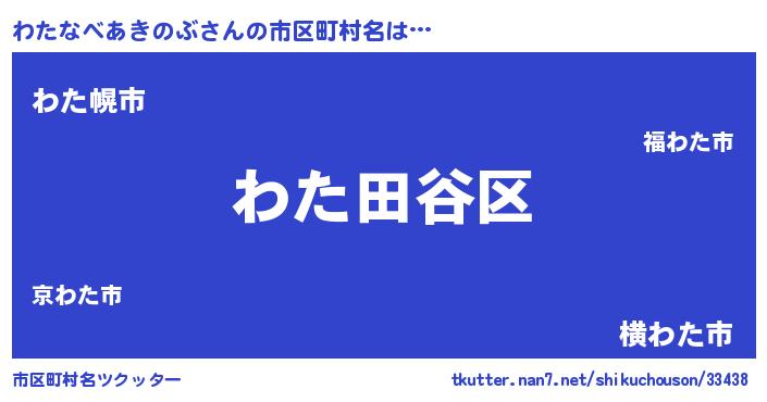 わたなべあきのぶさんの市区町村名は… 『わた田谷区』『わた幌市』『横わた市』 ツクッター #市区町村名ツクッター http://tkutter.nan7.net/shikuchouson/33438/