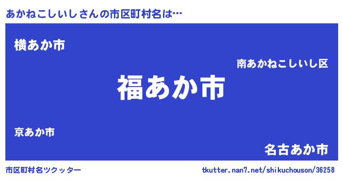 あかねこしいしさんの市区町村名は… 『福あか市』『横あか市』『名古あか市』 ツクッター #市区町村名ツクッター http://tkutter.nan7.net/shikuchouson/36258/