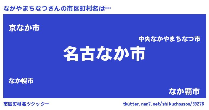 なかやまちなつさんの市区町村名は… 『名古なか市』『京なか市』『なか覇市』 ツクッター #市区町村名ツクッター http://tkutter.nan7.net/shikuchouson/39276/
