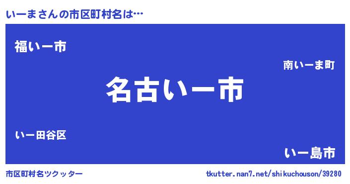 いーまさんの市区町村名は… 『名古いー市』『福いー市』『いー島市』 ツクッター #市区町村名ツクッター http://tkutter.nan7.net/shikuchouson/39280/