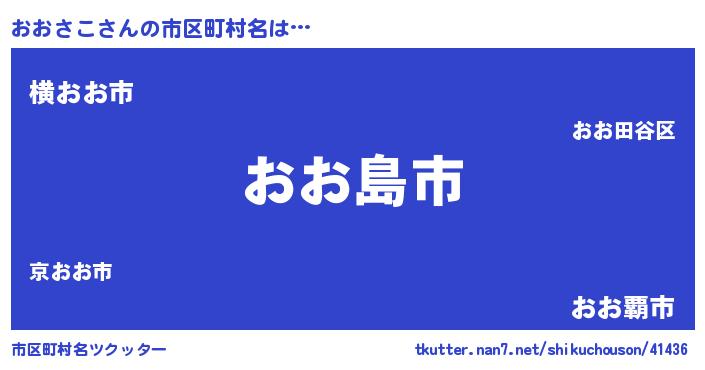 おおさこさんの市区町村名は… 『おお島市』『横おお市』『おお覇市』 ツクッター #市区町村名ツクッター http://tkutter.nan7.net/shikuchouson/41436/