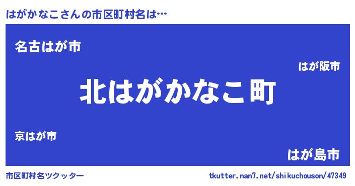 はがかなこさんの市区町村名は… 『北はがかなこ町』『名古はが市』『はが島市』 ツクッター #市区町村名ツクッター http://tkutter.nan7.net/shikuchouson/47349/