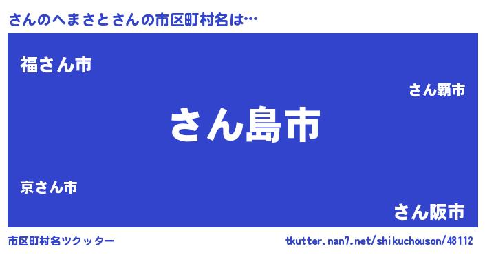 さんのへまさとさんの市区町村名は… 『さん島市』『福さん市』『さん阪市』 ツクッター #市区町村名ツクッター http://tkutter.nan7.net/shikuchouson/48112/
