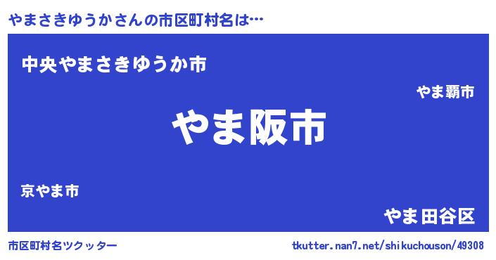 やまさきゆうかさんの市区町村名は… 『やま阪市』『中央やまさきゆうか市』『やま田谷区』 ツクッター #市区町村名ツクッター http://tkutter.nan7.net/shikuchouson/49308/