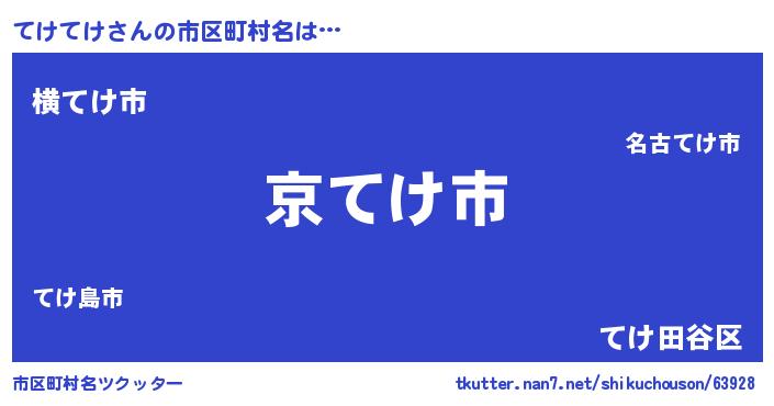 てけてけさんの市区町村名は… 『京てけ市』『横てけ市』『てけ田谷区』 ツクッター #市区町村名ツクッター http://tkutter.nan7.net/shikuchouson/63928/