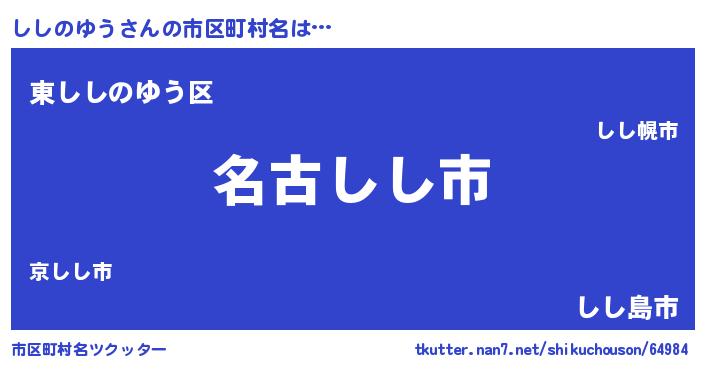 ししのゆうさんの市区町村名は… 『名古しし市』『東ししのゆう区』『しし島市』 ツクッター #市区町村名ツクッター http://tkutter.nan7.net/shikuchouson/64984/
