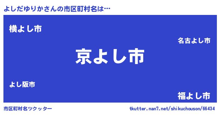 よしだゆりかさんの市区町村名は… 『京よし市』『横よし市』『福よし市』 ツクッター #市区町村名ツクッター http://tkutter.nan7.net/shikuchouson/66434/