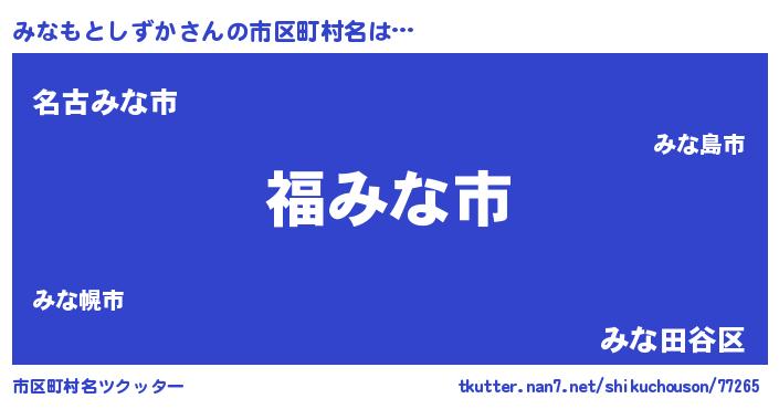 | 男性向けラノベタイトル風あだ名 | 『みなもとしずか~年齢イコール彼女いない歴の魔法使い~』 |