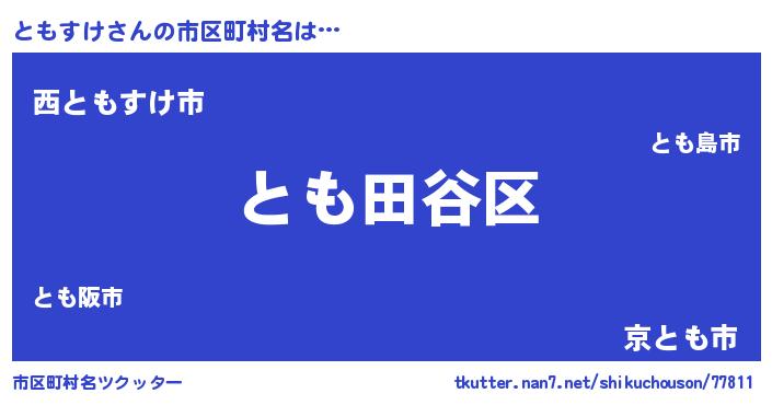 ともすけさんの市区町村名は… 『とも田谷区』『西ともすけ市』『京とも市』 ツクッター #市区町村名ツクッター http://tkutter.nan7.net/shikuchouson/77811/