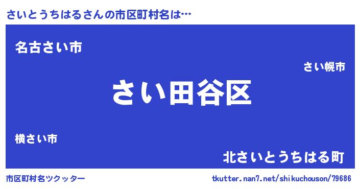 さいとうちはるさんの市区町村名は… 『さい田谷区』『名古さい市』『北さいとうちはる町』 ツクッター #市区町村名ツクッター http://tkutter.nan7.net/shikuchouson/79686/