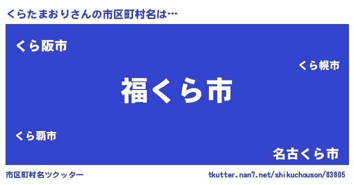 | 男性向けラノベタイトル風あだ名 | 『くらたまおり~年齢イコール彼女いない歴の魔法使い~』 |
