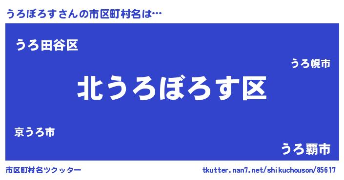 うろぼろすさんの市区町村名は… 『北うろぼろす区』『うろ田谷区』『うろ覇市』 ツクッター #市区町村名ツクッター http://tkutter.nan7.net/shikuchouson/85617/