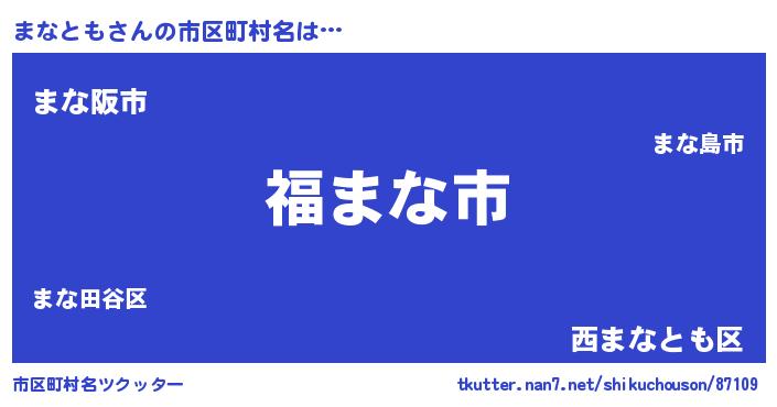 まなともさんの市区町村名は… 『福まな市』『まな阪市』『西まなとも区』 ツクッター #市区町村名ツクッター http://tkutter.nan7.net/shikuchouson/87109/