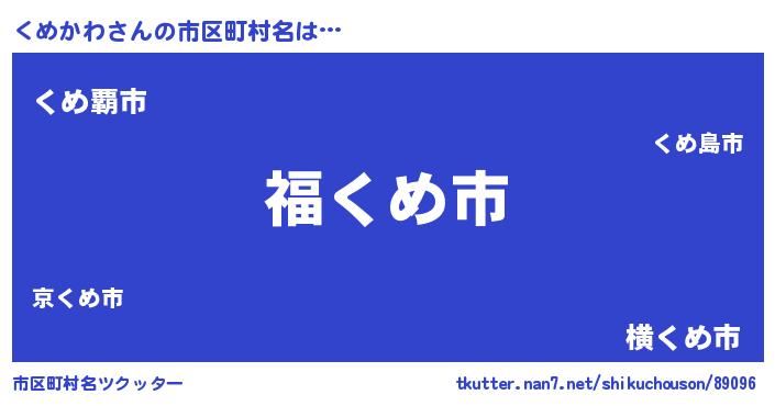 くめかわさんの市区町村名は… 『福くめ市』『くめ覇市』『横くめ市』 ツクッター #市区町村名ツクッター http://tkutter.nan7.net/shikuchouson/89096/