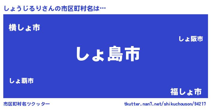 しょうじるりさんの市区町村名は… 『しょ島市』『横しょ市』『福しょ市』 ツクッター #市区町村名ツクッター http://tkutter.nan7.net/shikuchouson/94217/