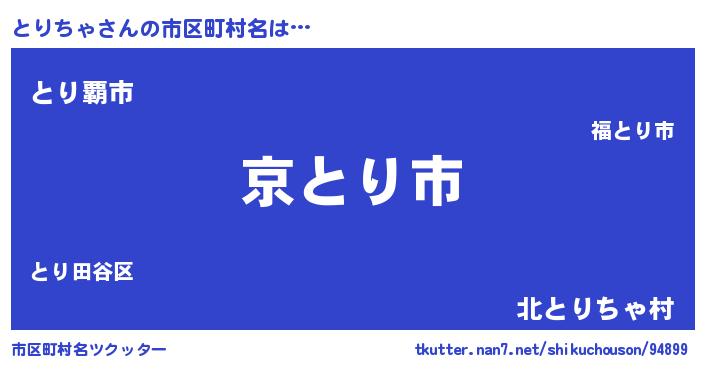 とりちゃさんの市区町村名は… 『京とり市』『とり覇市』『北とりちゃ村』 ツクッター #市区町村名ツクッター http://tkutter.nan7.net/shikuchouson/94899/