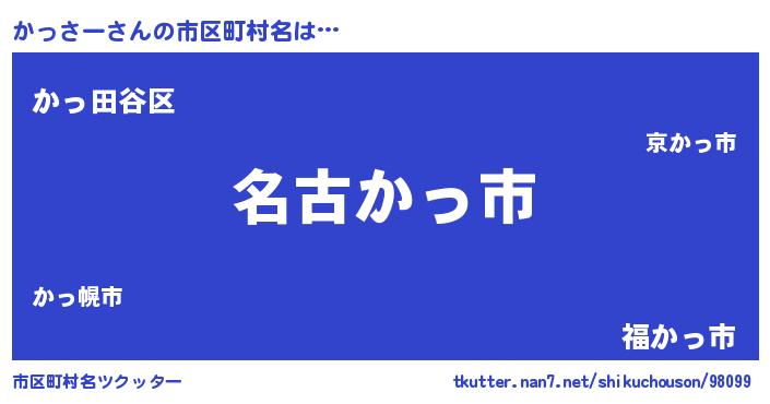 かっさーさんの市区町村名は… 『名古かっ市』『かっ田谷区』『福かっ市』 ツクッター #市区町村名ツクッター http://tkutter.nan7.net/shikuchouson/98099/