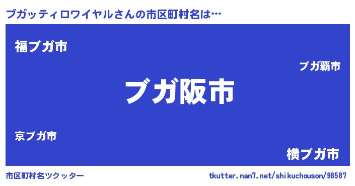 ブガッティロワイヤルさんの市区町村名は… 『ブガ阪市』『福ブガ市』『横ブガ市』 ツクッター #市区町村名ツクッター http://tkutter.nan7.net/shikuchouson/98587/